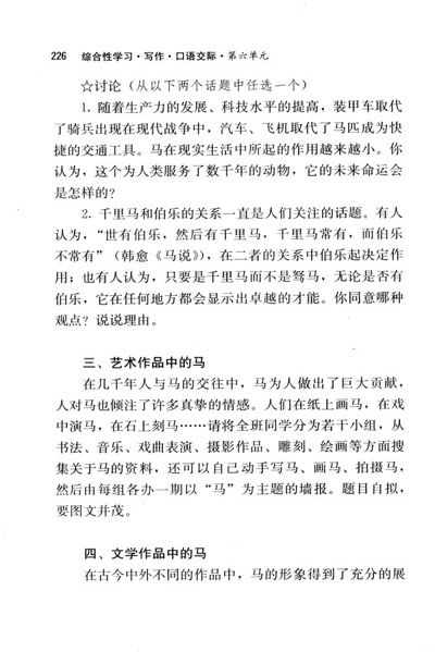 习作六:一、在几千年人与马的交往中,马为人做出了巨大的贡献,人对马也倾注了许多真挚的情感。人们在纸上画马,在戏中演马,在石上刻马……请将全班同学分为若干小组,从书法、音乐、戏曲表演、摄影作品、雕刻、绘画等方面搜集关于马的资料,还可以自己动手写马、画马、拍摄马,然后由每组各办一期以“马”为主题的墙报。题目自拟,要图文并茂。