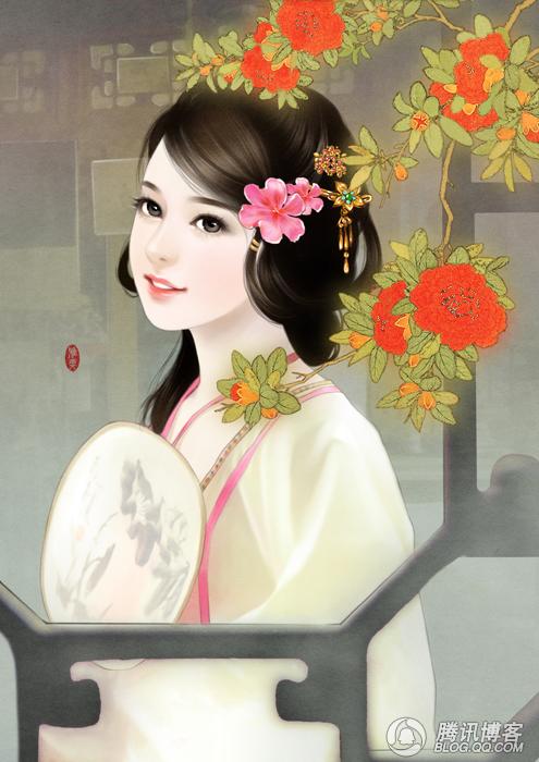 赫斓微微上了淡淡的妆,手持苏绣蚕丝扇,身着乳白色轻纱衣。巧笑嫣然,带着未出阁的女儿家的一丝娇羞,美得不食人间烟火。巧手梳了一个垂墨七卷髻,垂下一缕青丝在胸前,两朵粉色的杜鹃花嵌在刘海儿边,更添一丝纯美。随手插上一支绿蕊流苏簪,金色的流苏随风摇曳,叮咚作响。金丝红玛瑙发饰更衬得赫斓小巧可爱。