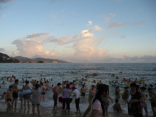 我们在海里扑腾,抱着泳圈在能点地的地方畅爽游水的乐趣。虽然我们并不很会游,但海水的清凉的确令我们喜欢。