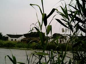 不知不觉,小船已漾出神秘莫测的苇塘迷宫来到一片开阔的水面,只见一个古老的村落呈现在眼前,那就是芦花村,那一定是现代京剧《沙家浜》里红石村的原形。因为正值电视剧《沙家浜》拍摄之中,我们不能靠近,但我还是远远地眺望着,拍下了几张珍贵的照片。