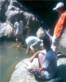 渡过“生死坡”,跨过“荣耀门”,大家又悠闲起来了。不过大自然为我们这些客人还真是准备地很充分。这里有一个被石头围起来的小石潭,潭中心有一块石头,我哥和一个朋友跳了过去,坐在那里,很是悠闲。我表弟幽默地说,他们真像一对小情人。我想,热爱着大自然的人们都是大自然的情人吧!图9的那只小可爱,就是我家的小狗了,看,大概不只是人,连那些一生守着家门的小动物也会有怡花赏月之兴吧!不知待到我家小狗也近暮年再次看到这幅照片时,它会作何感想呢?