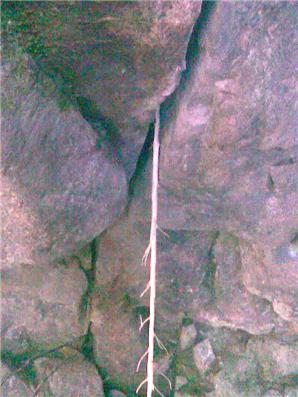 这两张是在小涧的石头上照下来的。毕竟已入深山,往往可以看到许多小动物。甚至可以看到水潭中漂着动物的尸体,我抬头一望便看到一线峡谷,四周都是峭直的悬壁,彼有压顶之势,因而我们认为小动物是从上面掉下来摔死的。如今也只能留下照片来悼念这些大自然的不幸者了。(都腐烂了,不好意思发上来,删了,对不起那兔子了)我们来到这里最大的感想是觉得这里所到之处无不充满着生命的气息。在第四张图片中,我们可以看到一只蟾蜍吸附在岩石壁上。能够发现它,我们觉得自己已经是足够幸运,这灵动的生命让我们感受到了大自然永远年轻的心。第五张是从石缝中伸出来的一条树根,岩石的上面有着茂盛的翠竹,我们猜想这根一定是竹子为了寻找水源而冲破了重重阻碍,才让我们看到了这生命的奇迹。此时想起了课本里的那篇《石缝间的生命》,感受到了生命的的顽强与坚韧。我想它所面临的困难不比我们人生道路上的困难小,而它们的决心却比石头更加坚强,更加不可动摇。我们所目睹的奇迹诞生于永远充满张力,永远不言弃的生命的意念。