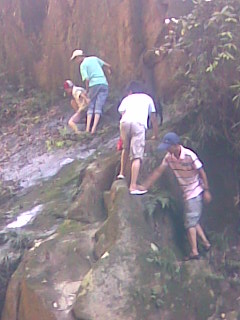 三点左右的时候,我们面临着一个挑战。这是一个石坡,这里常年都有山泉水从坡上流下来,虽然不会太陡,但坡道很滑,我们称它为“生死坡”,虽然略有夸张之意,不过也足以见其险。坡的下面有一口深潭,看下去像一个月亮的形状。因为独特的地势,这里几乎整天都没有阳光直射进来。大概也是因为这样的情况,这里的水十分冰凉,在这里淌水,有点如履薄冰的感觉。图6中,我的朋友们手帮互着手,协同走过那里,最前面俩个是用一些树叶垫脚走过去的,如果人太重了,就会一点一点地滑下,团结让我们有了安全感,我们知道,如果只靠一个人想走过去,我们所面临的挑战将会更大。走过这个“生死坡”就是“荣耀门”了,“荣耀门”是由一棵树构成的,整棵树的主杆卧倒在地上,它繁生出来的枝杆竖直起来,两根枝杆生长到末端的树枝又交结在一起,成了一个门的形状。这也许是大自然的杰作,或者是上帝作为为了迎接勇士而带来的惊喜。在一行人中,我是最后一个过“生死坡”的。大家看到我过“荣耀门”时湿了一块的裤子,也大概可以想象到我跪倒在大自然脚下,才勉强爬过来的情景了。