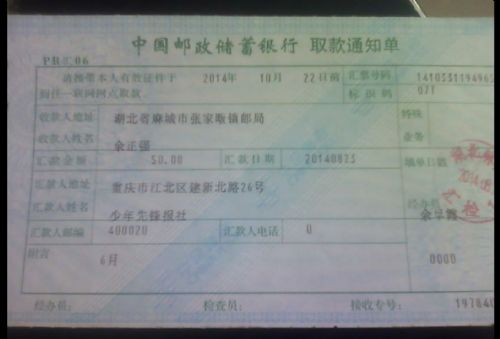 这张汇款单来自2014年的夏天,署名是重庆少年先锋报社。
