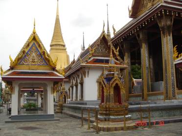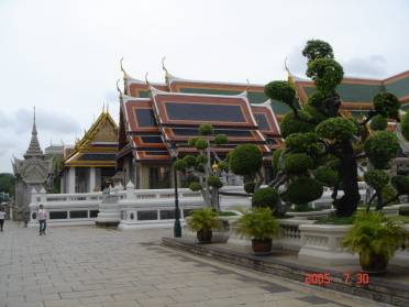 吃完午餐,我们去大皇宫参观。导游说:“大皇宫包括一所建在皇宫里作为国王举行宗教仪式的佛寺----玉佛寺,都在1780年开始建造,总面积约218,000平方米,环绕着整座大皇宫的宫墙,长约1900米。下车以后,我们过马路,发现汽车在人行横道后面停下来,这样好让行人过,不像中国人开车的时候在人行横道里面停,让行人不好过。泰国人的文明给我留下很深的印象。到了大皇宫以后,里面的景色非常漂亮,我照了很多相片。导游说:“如果走丢了,就在门口等着。”我们到了玉佛寺,把鞋脱了下来,去拜佛,为了对佛尊重,所以不让照相。接着我去看别的地方,我也用照相机照了下来。