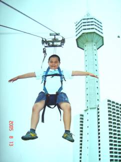 游完泳之后,我们上旅游车,去芭提亚56层观光塔“云中漫步”。导游说:“芭提亚有两个海,一个海叫芭提亚海,另一个海叫中华海,到了56层观光塔,就可以看到这些海,这就是芭提亚最高的楼。”我们到了塔的56层,“哎呀,好高呀!”,我惊奇地说。“云中漫步”,就是用绳子栓着,从56层高楼上滑下来,有双人和单人的两种。由于楼很高,大家都非常害怕,很少有人敢做“云中漫步”,尤其是单人“云中漫步”,但我非常勇敢,我和爸爸相互鼓励,决定试试单人“云中漫步”,而且我还是第一个试的。说实在的,刚开始时我非常害怕,可是一下去,我就一点都不害怕。我还以为一下子滑下去呢,看起来很快,其实很慢,到地上以后,我认为没有想象的刺激。最后,我们一起23个人,一共只有包括我和爸爸在内的三个人敢试“云中漫步”,我非常自豪!